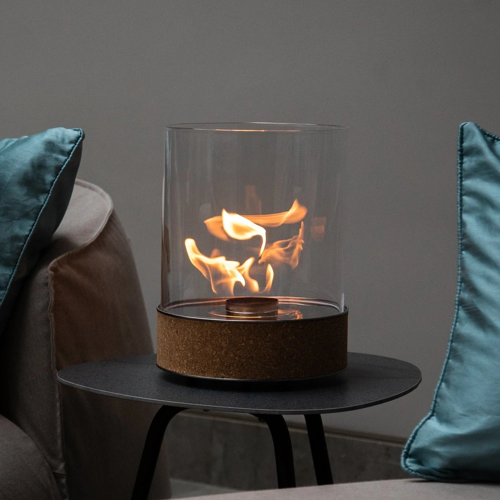 Lako prenosiv, okrugli bio kamin sa atraktivnom završnom obradom od hrastove plute koja pojačava prirodan izgled vatre. Zatvoren je staklenim cilindrom koji štiti plamen od vetra, čineći ga stabilnim u svim vremenskim uslovima.