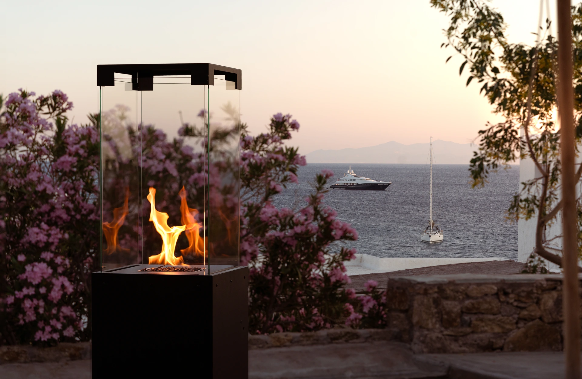 Ergonomski oblik obezbeđuje ravnomernu distribuciju toplote. Gorionik je sa 4 strane pokriven staklenim panelima i čeličnim poklopcem sa gornje strane koji u slučaju kiše štiti plamen od gašenja. Kućište premazano crnim slojem praha čini kamin otpornim na oštećenja. Paneli od kaljenog stakla su pouzdana zaštita dece i kućnih ljubimaca od vatre, a u slučaju vetrovitog vremena čuvaju plamen.
